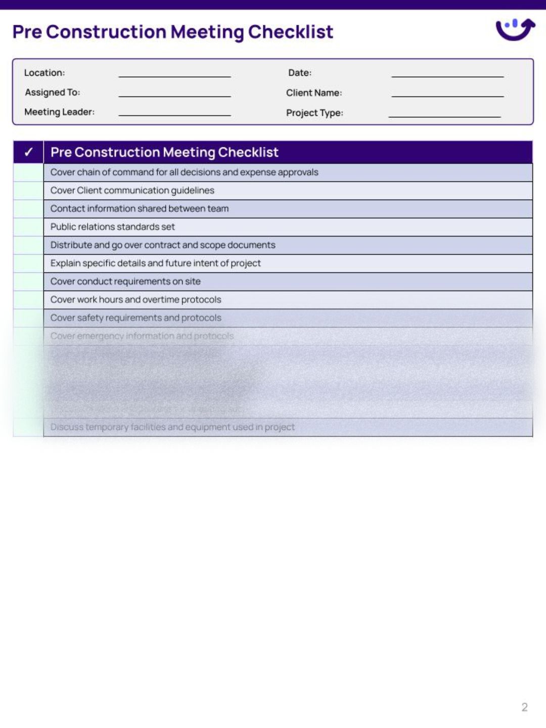 View or download free pre construction meeting checklist to help you organise all the tasks from this web page. First ???day of every month at ??:?? In this meeting, the blueprints are laid out and architects usually ask their clients on their suggestions and changes in the sample plan. Ensure all necessary visual aids (diagrams, videos).